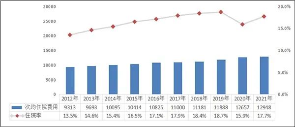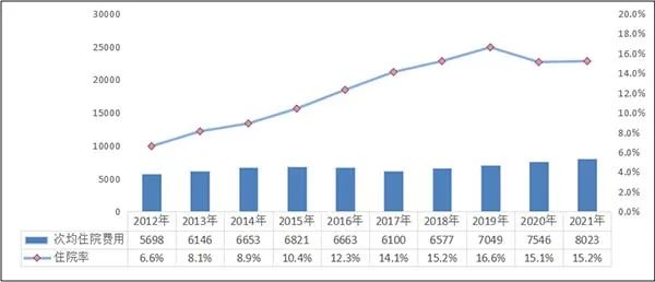 2012-2021年居民医保次均住院费用和住院率