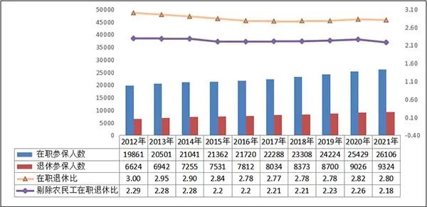 1.参保人数。截至2021年底,职工医保参保人数35431万人,比上年增加976万人,增长2.8%,其中,在职职工26106万人,比上年增长2.7%;退休职工9324万人,比上年增长3.3%。在职退休比为2.80,较上年下降0.02。